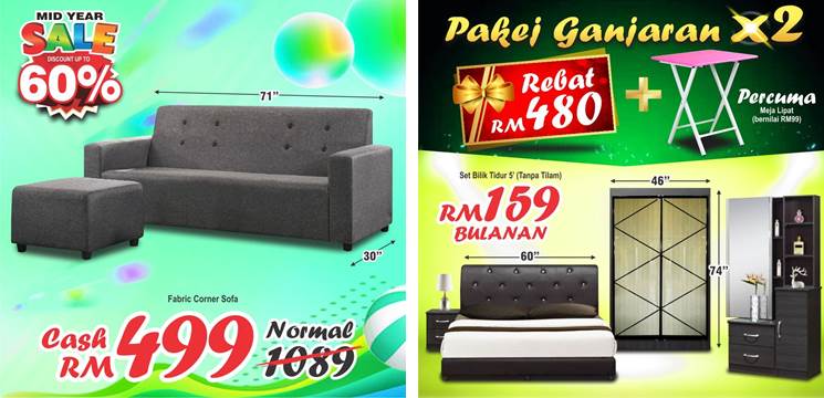 Antara perabot yang dijual ialah set ruang tamu, set bilik tidur, barang eletronik dan pelbagai lagi. Reka bentuk perabot yang terdapat disini juga akan membuat anda rambang mata untuk membuat keputusan.