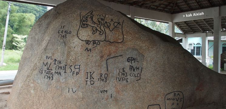 Berdekatan dengan laut di Teluk Gedong ialah batu gergasi ini yang diukir dengan simbol Syarikat Hindia Timur Belanda (Vereenigde Oost-Indische Compagnie; VOC) dan coretan lain, termasuk gambar pudar seekor harimau yang mencuri seorang budak. Mengikut sejarah tempatan, anak seorang pembesar Eropah hilang ketika bermain dekat dengan batu. Pihak Belanda menguar-uarkan idea penculikan harimau, walaupun budak itu lebih berkemungkinan diculik oleh warga tempatan yang marah.