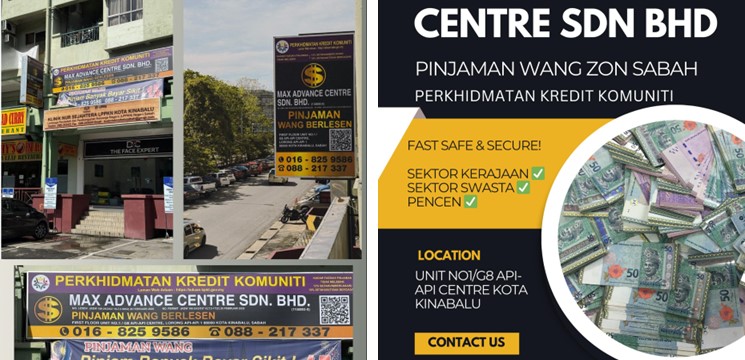 Max Advance Centre Sdn Bhd merupakan perkhidmatan kredit komuniti yang menawarkan antara pinjaman wang berlesen yang berada di Kota Kinabalu, Sabah. Syarikat ini menawarkan kadar faedah yang terendah di sabah dan pembayaran balik pinjaman yang flexsibel. Pinjaman wang berlesen tidak memerlukan wang pendahuluan dan tidak memerlukan sebarang cagaran. Kelulusan permohonan pinjaman wang hanya mengambil masa 30minit sahaja dan pemohon dapat pinjaman secara tunai. Semua kakitangan kerajaan, pencen, kebajikan, zakat dan semua sektor swasta layak untuk memohon pinjaman di syarikat ini.